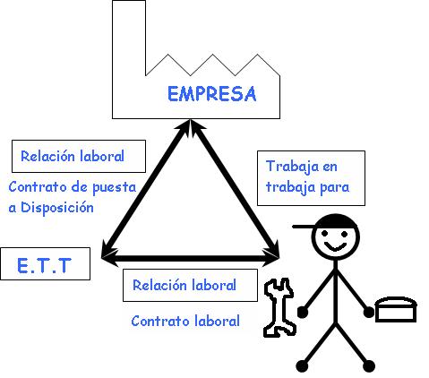Este tipo de empresas contratan temporalmente a los trabajadores/as en su plantilla para “cederlos” a otras empresas, que son clientes suyos. Por tanto, es la E.T.T. la que paga el sueldo, la Seguridad Social y le concede las vacaciones al trabajador/a, aunque éste/a preste sus servicios en las instalaciones de la empresa cliente; quien a su vez, tiene un contrato mercantil con la E.T.T.. Es lo conocido por Relación Triangular.